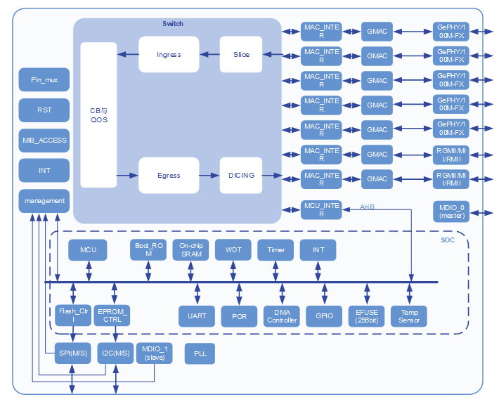 支持外接CPU通过IIC/MIIM/SPI接口进行管理