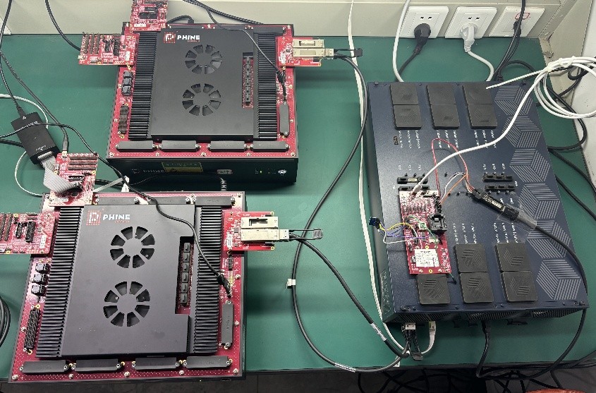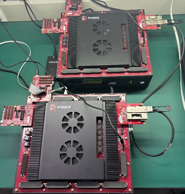 Two FPGA-VU19P systems are interconnected via DAC cables to simulate point-to-point GPU communication utilizing the UALink interface IP. This setup validates the protocol functionalities of the Physical Layer (PL), Data Link Layer (DL), Transaction Layer (TL), and UALink Protocol Layer Interface (UPLI).
